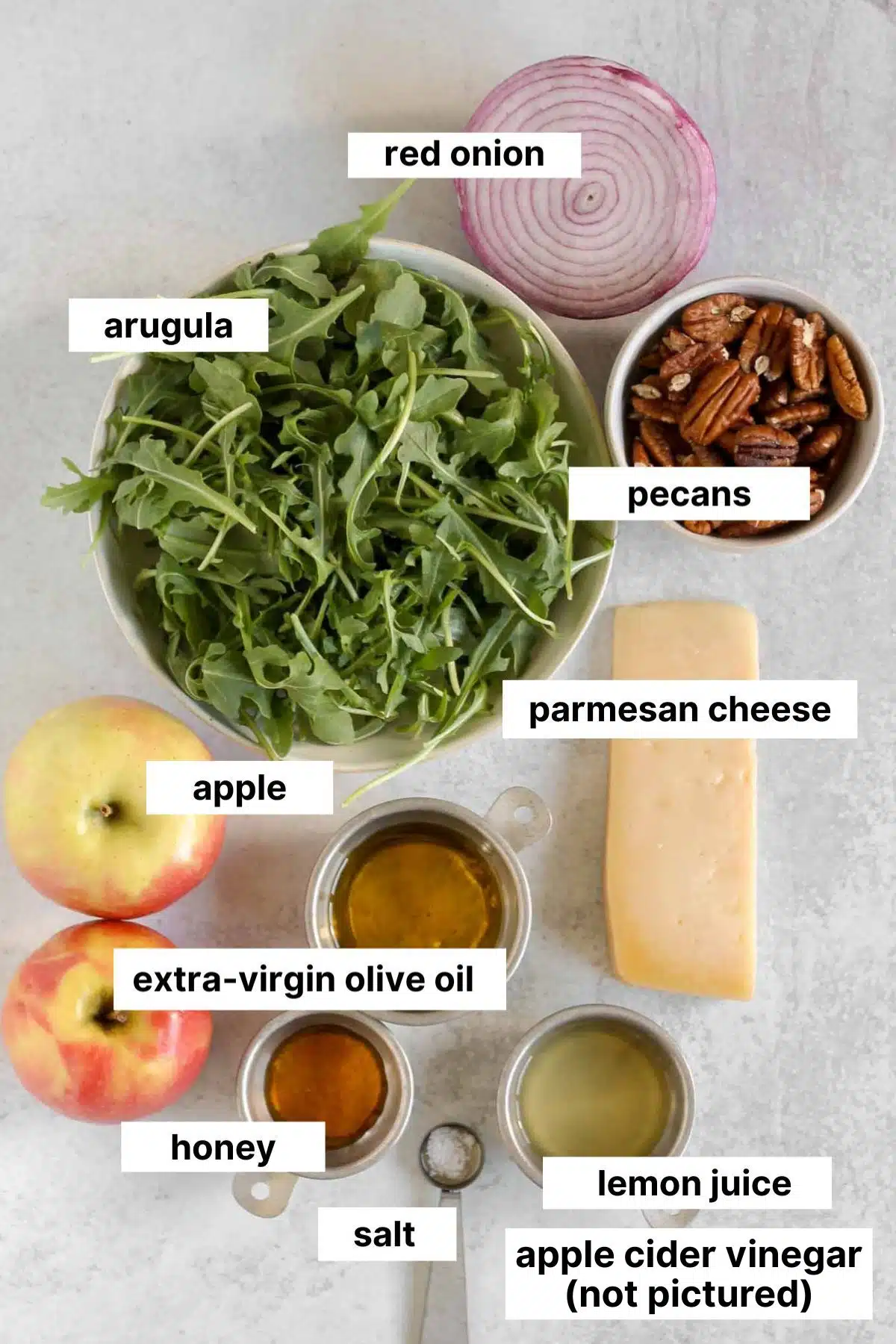 Use a shallow bowl, or platter, for serving: The apples and pecans will weigh the arugula down, so for the best presentation, and distribution of toppings, assemble the salad using a shallow bowl or platter.