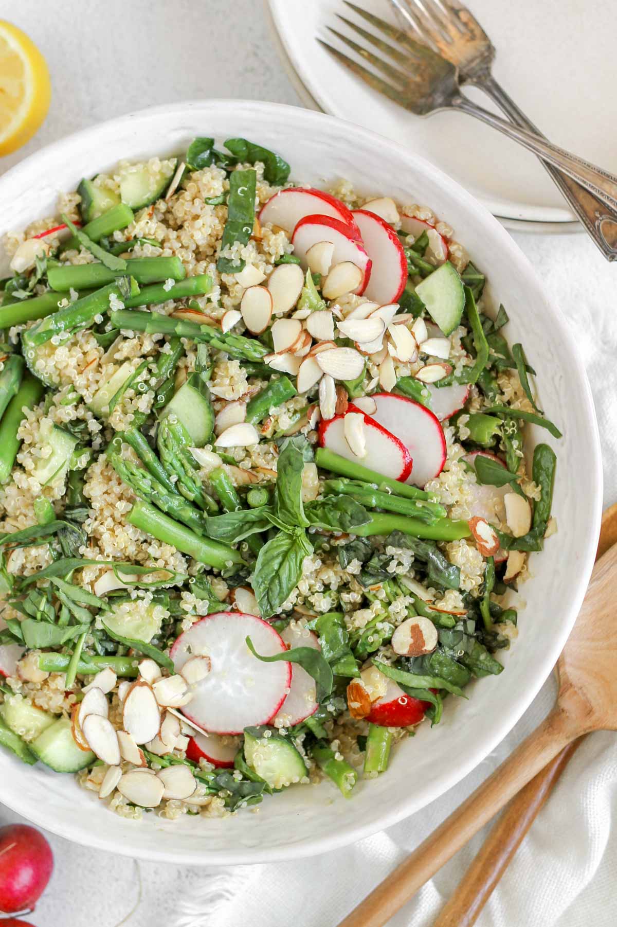 - To a large serving bowl, add the cooked and cooled quinoa, asparagus and remaining salad ingredients.1 cup thinly sliced radishes, 2 cups chopped spinach, 1 cup chopped cucumber, 5-10 basil leaves, chopped, ½ cup sliced almonds